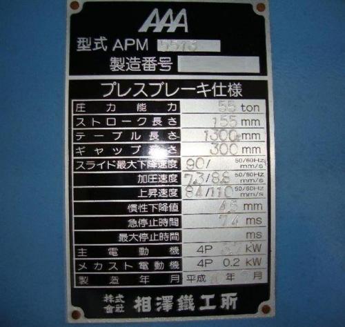 板金機械【2011029】相澤鐵工所製中古板金機械ブレーキプレスAPM5513平成10年製買取